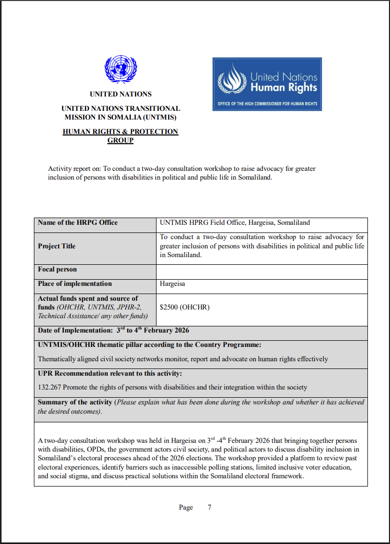 A two-day consultation workshop was held in Hargeisa on 3–4 February 2026 by the UNTMIS Human Rights and Protection Group to promote the inclusion of persons with disabilities in Somaliland’s political and electoral processes.